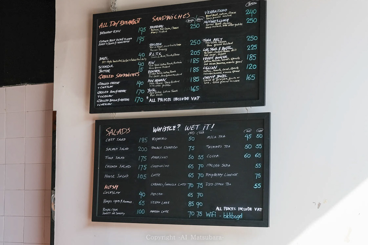 珈琲とベーグルサンドを注文すると、800円〜1,000円ぐらいになります。物価の安いバンコクのローカル飯に比べると値段はやや高めな印象ですが、ベーグルショップとしては日本と大差ない価格です。