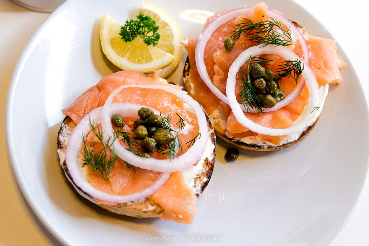 一通りメニューを吟味したあと、スタッフさんに一番の売れ筋を聞くと「ロックス&クリームチーズ」を勧められたので、今回はそれを注文てみます。ロックスは「スモークサーモン」という意味で、ベーグル店では定番のメニューです。