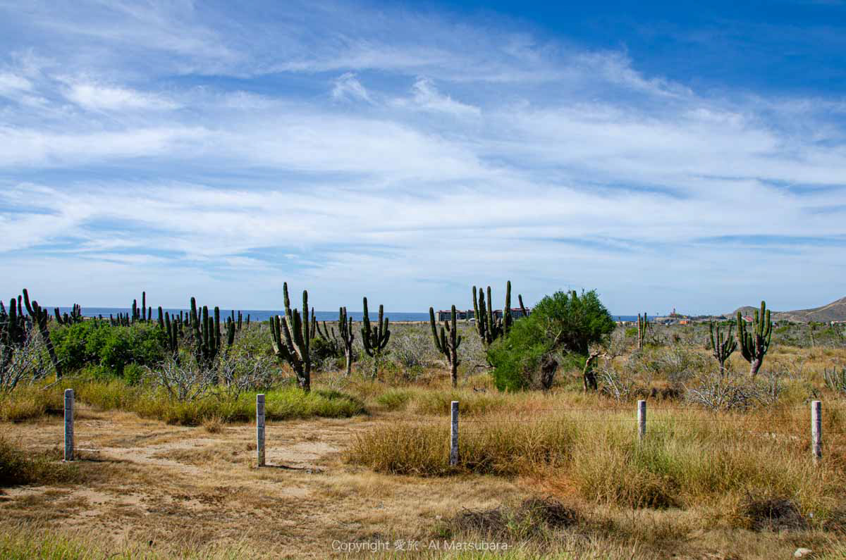 メキシコの象徴でもある大きなサボテンの向こうに海が見える。