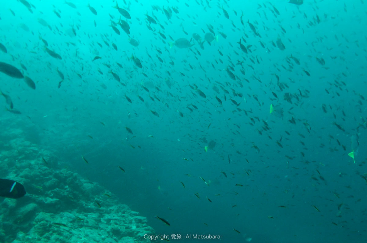 小魚ちゃんがたくさん群れてるけどハンマーヘッドの影は見当たらない。