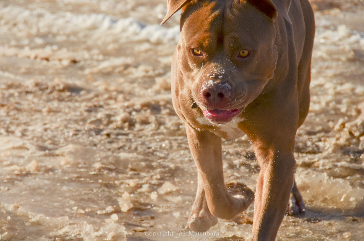 目を開けると、アメリカン・ピット・ブル・テリアのコナー♂が、まさに今から私の顔をベロリと舐めようとせまってきていた。
