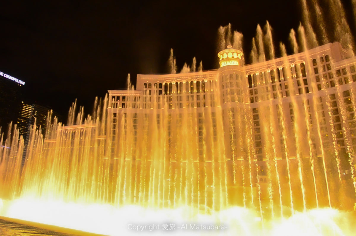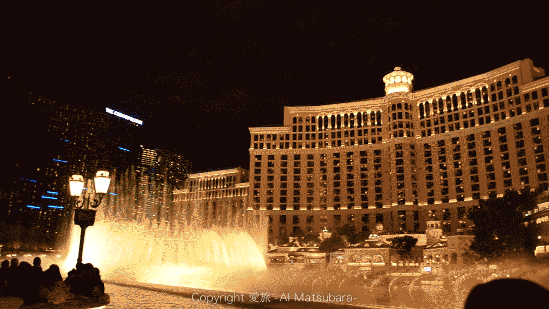 場所はベラージオから道路を渡った目の前だけど、木が邪魔で噴水は隙間からしか見れなかった!爆笑)