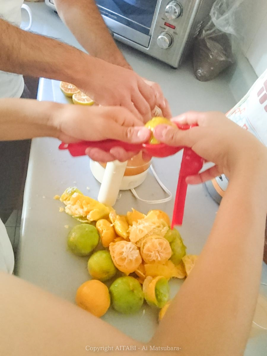 ベティちゃんのお庭で採れたオレンジをみんなで絞ってジュースを作ったりもしたよ。絞っても絞ってもちょっとしかジュースにならないから、みんなで大事にシェアしたり(笑)