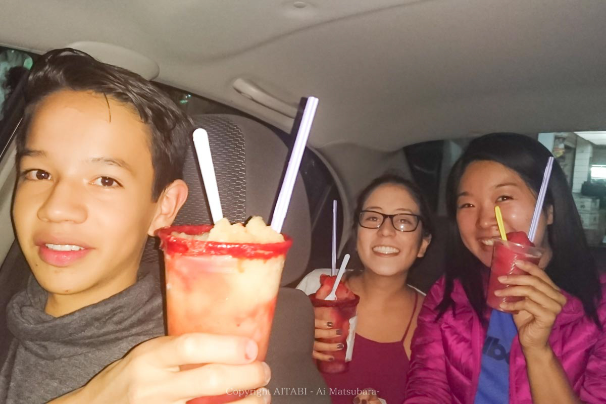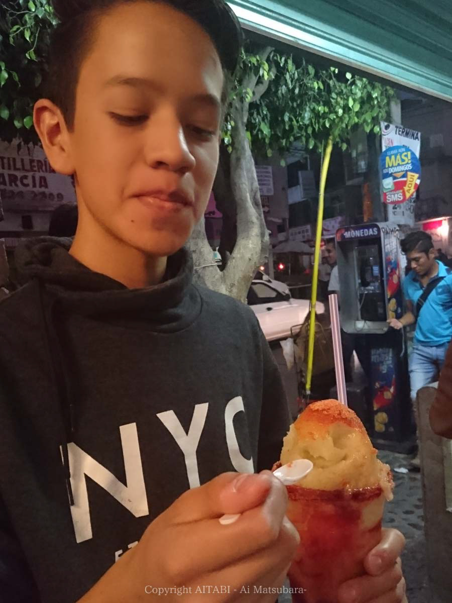 ちなみに、私たちが手に持ってる赤いのは「チャモイ」というメキシコの代表的スイーツ!塩と梅干しとコチュジャンを混ぜたようなソースをかき氷にかけて食べるんだけど、なかなか厳しいお味です(←)