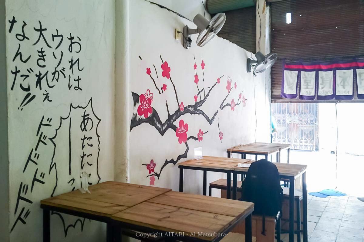 日本食堂(にっぽんしょくどう)の中に入ると、いきなり飛び込んで壁絵!