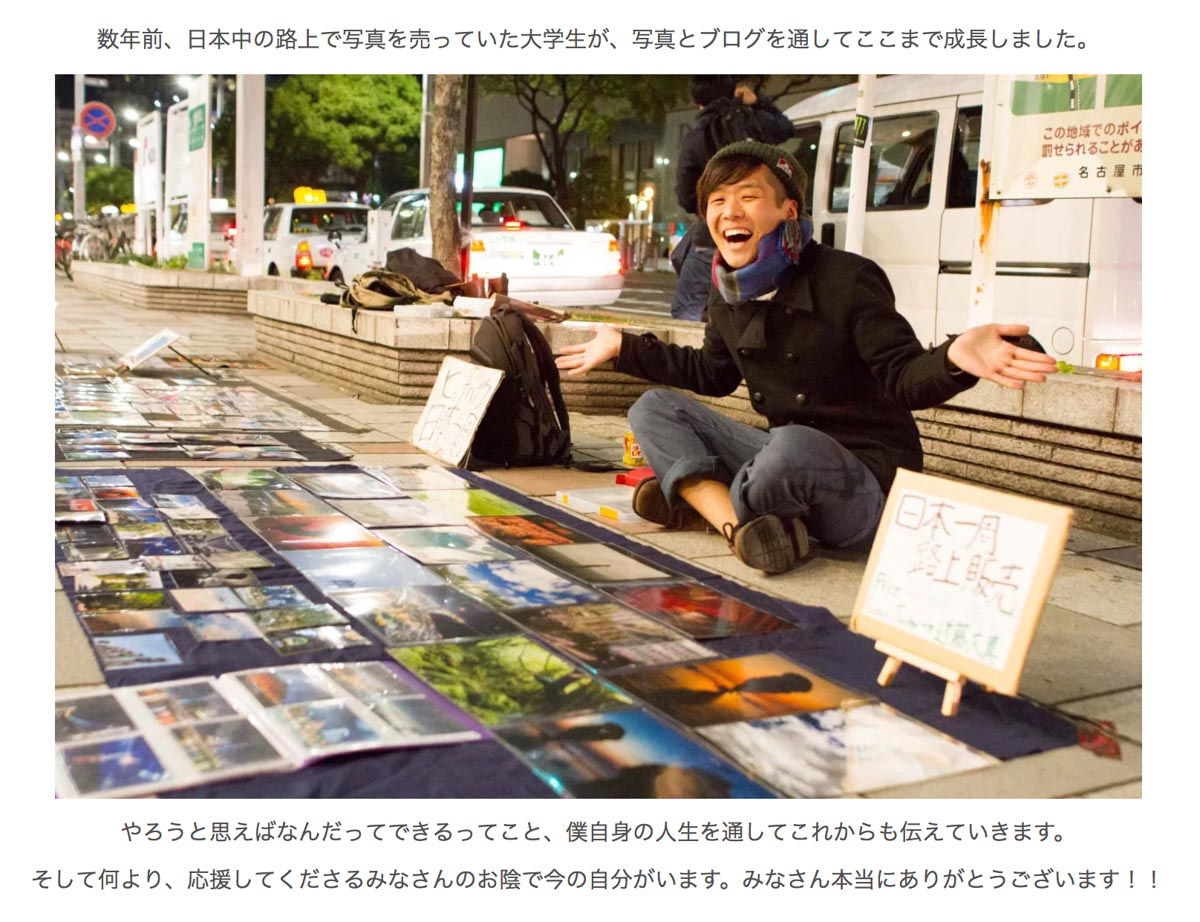 数年前、日本中の路上で写真を売っていた大学生が、写真とブログを通してここまで成長しました。