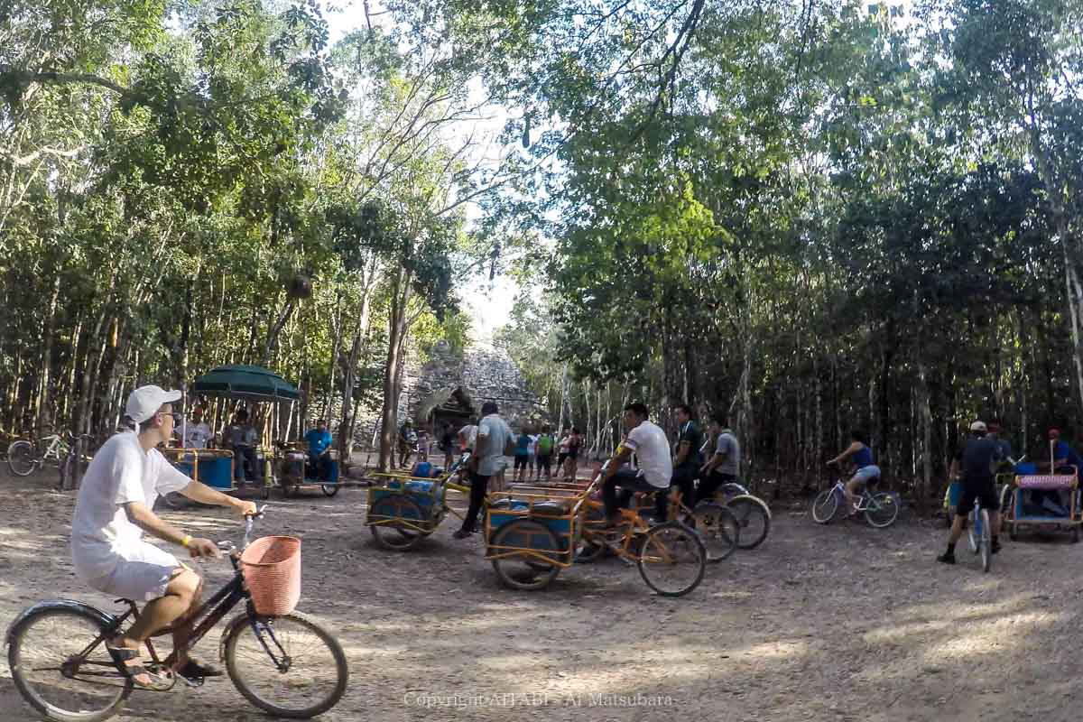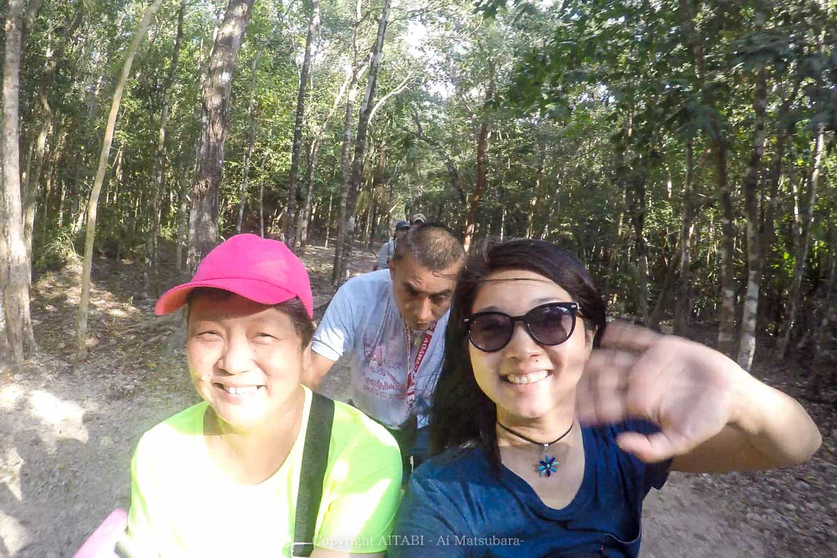 たまたま、カンクンから同じバスに乗ってきたフィリピン系アメリカンのご家族さんが「一緒に乗らない?」って声をかけてくれたので、私たちは自転車タクシーに乗って森林を抜けることにした。